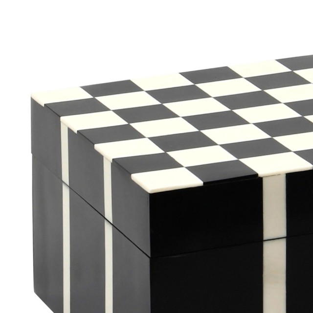 Deze exclusieve design decoratie box in zwart/wit is van hout voorzien van een laag resin (epoxy). De stukjes zijn ingelegd, de binnenkant en onderkant is voorzien van zwart fluweel.