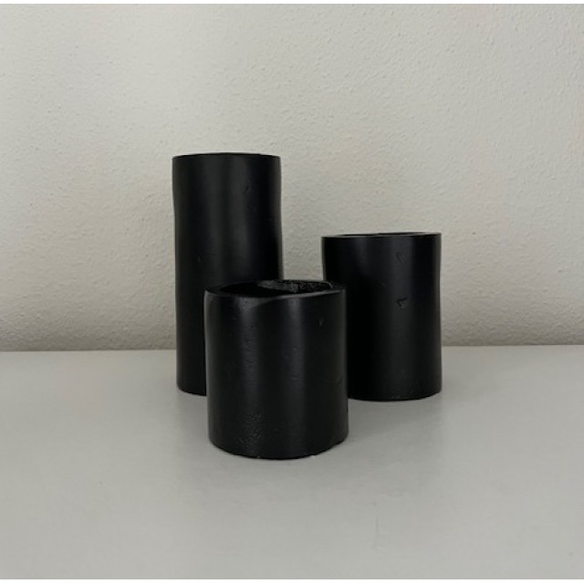 Set Pilar is gemaakt van stoer mat zwart metaal en ze hebben een doorsnede van 6 cm en zijn 6-8 en 13 cm hoog.